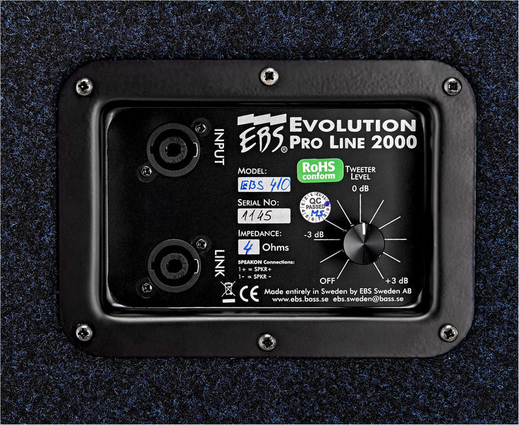 EBS ProLine 410, bass cabinet, 800 watts rms into 4 ohms, 4x10" speakers and 2" titanium tweeter, volume 116 liters, frequency response 70 - 18k Hz, 103 dB sensivity, neutrik speakon connectors, dimensions whd: 58 x 69 x 44 cm, weight: 41 kg.