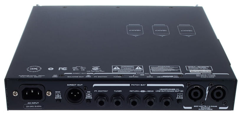 Gallien Krueger MB Fusion 800, hybrid bass head, 800 watts @ 4 ohms, all tube preamp (3x 12AX7), digital power amp, headphone/line out, 4-band active EQ, variable contour with mid frequency select, effects loop, mute Switch, XLR out with pre/post EQ and ground lift, two speakon outputs, dimensions: 27,31 x 31,12 x 4,45 cm, weight: 2,5 kg.