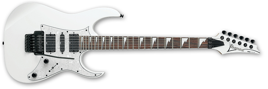 Ibanez RG350DXZ-WH electric guitar - 3 piece Wizard III neck, rosewood Fretboard, 24 Frets, Nut width 43mm, basswood body, Edge Zero II Tremolo, Ibanez INF3 (H) neck pick-up, Ibanez INFS3 (H) mid pick-up, Ibanez INF4 (H) bridge pick-up, Colour: White.