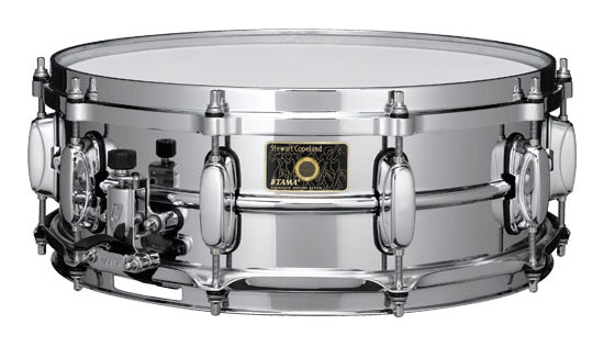 Stewart Copeland's signature model is a faithful reproduction of the snare drum of "mysterious provenance" that he used with the Police and everything else from that time period. A thicker 1.5mm brass shell and the combination of a die-cast batter hoop with a triple flanged bottom hoop provides sounds that easily penetrate what Copeland describes as the "dirge from the bass and the ear-piecing sounds of a guitar."